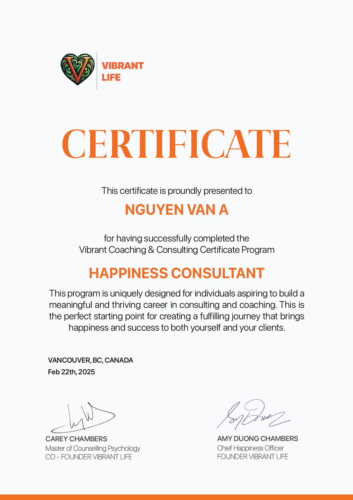 Sau khi hoàn thành khoá học và đáp ứng đủ các điều kiện đưa ra bạn sẽ nhận chứng nhận Happiness Consultant được cấp bởi công ty Vibrant Coaching & Consulting Canada - Nâng cao lợi thế của bạn trong công việc và kinh doanh.